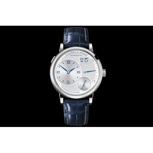A. Lange & Söhne 191.066 Lange 1 25º Aniversário, 191066. Edição limitada de 250 peças no total para comemorar o 25º aniversário da Lange, caixa meio-hunter em ouro branco 18k com pulseira e fivela de pino em ouro branco 18k, novo movimento de corda manual A. Lange & Söhne calibre L121.1, reserva de marcha de 72 horas, mostrador em prata maciça com marcadores e ponteiros azuis, data grande, pequenos segundos, indicador de reserva de marcha, fundo da caixa meio-hunter gravado com uma representação da sede da Lange de 1873, os nomes de Walter Lange e Gunter Blumlein e a inscrição 25 JAHRE LANGE 1, resistente à água, diâmetro: 38,5 mm, espessura: 10,7 mm. Réplica do relógio A. Lange & Sohne Lange 1 25º Aniversário 191.066 18k WG Half Hunter LIMITED, preço acessível e qualidade AAA.