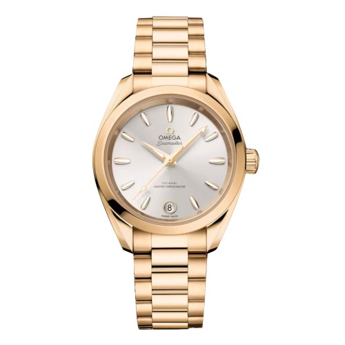 Este modelo de 34 mm é fabricado em aço polido Moonshine® de 18 quilates. O relógio apresenta uma coroa cônica, um fundo de caixa com bordas onduladas e um cristal de safira plano. O mostrador prateado com acabamento escovado e laqueado possui uma janela de data circular às 6 horas, circundada por ouro Moonshine de 18 quilates. A OMEGA também utilizou ouro Moonshine de 18 quilates nos ponteiros facetados e nos marcadores de horas distintos, que têm o formato de cascos de veleiros e são preenchidos com Super-LumiNova branca. A pulseira em ouro Moonshine de 18 quilates combina com o relógio e ele é movido pelo calibre 8801 Co-Axial Master Chronometer da OMEGA, certificado segundo o mais alto padrão da indústria pelo Instituto Federal Suíço de Metrologia (METAS).
