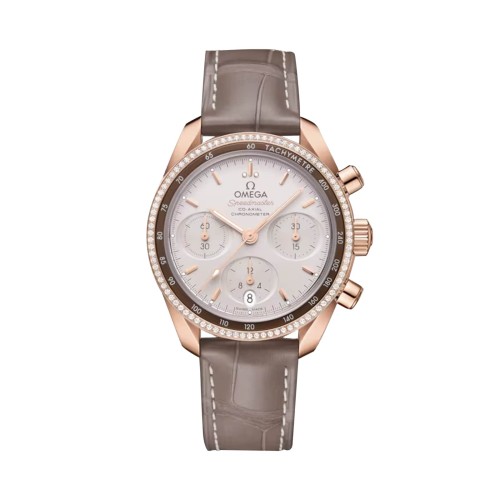 Este modelo apresenta uma caixa totalmente em ouro Sedna® 18k com um design de bisel duplo. A seção interna do bisel apresenta uma escala taquimétrica em um anel de alumínio marrom, enquanto a seção externa é cravejada de diamantes. O mostrador cappuccino inclui submostradores ovais horizontais marrons e uma janela de data oval vertical às 6 horas. Os marcadores de horas e os ponteiros são feitos de aço Sedna® banhado a ouro 18 quilates com Super-LumiNova branca nos ponteiros de horas, minutos e segundos do cronógrafo. O relógio possui uma pulseira de couro taupe, um medalhão de cavalo-marinho no fundo da caixa e é movido pelo Calibre Co-Axial 3330 da OMEGA.