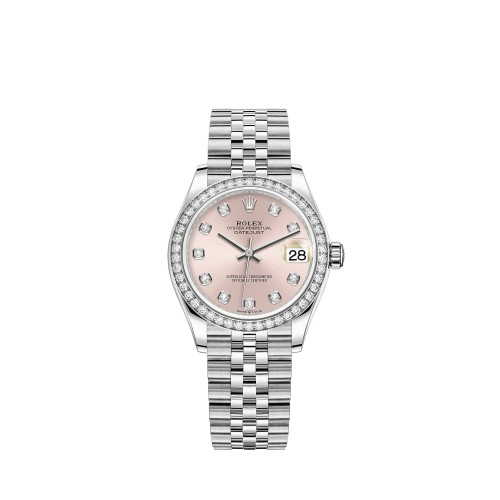 Rolex Datejust 31 com bracelete Jubilee em Rolesor branco e mostrador cravejado de diamantes rosa.