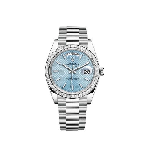 Rolex Day-Date 40 em platina com mostrador azul gelo, padrão quadrante e bisel cravejado de diamantes.