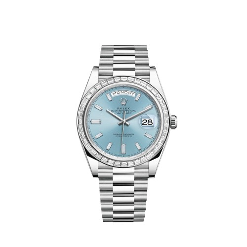 Etiquetas: Réplica do Rolex Day-Date 40 em platina com mostrador e bisel azul gelo cravejados de diamantes. Relógio, Réplica Relógio ROLEX DAY DATE m228396tbr-0002