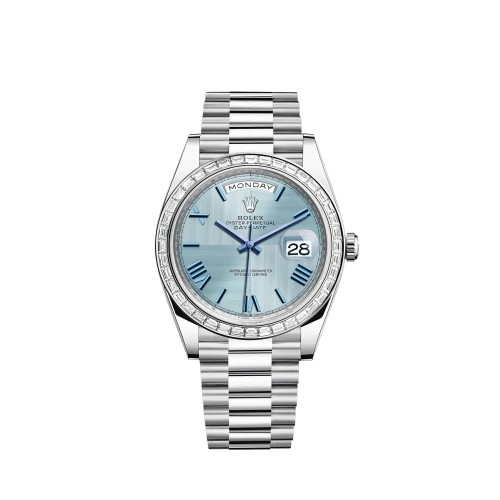 Etiquetas: Réplica do Rolex Day-Date 40 em platina com mostrador azul gelo, padrão quadrante e bisel cravejado de diamantes. Relógio, Réplica Relógio ROLEX DAY DATE m228396tbr-0004