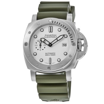 Informações do autêntico relógio masculino Panerai Submersível QuarantaQuattro Bianco com mostrador branco de borracha Modelo PAM01226. Caixa de aço inoxidável escovado com pulseira de borracha verde. Moldura de aço inoxidável. Descrição do mostrador: ponteiros pretos e marcadores de horas de ponto/índice e um pequeno submostrador de segundos em um mostrador branco. Movimento automático. Calendário: Data às 3 horas. Exibição dos submostradores do cronógrafo: pequenos segundos. Equipado com motor Panerai Calibre P.900 com 72 horas de reserva de marcha. Funções do relógio: Reserva de energia, Hora, Minuto, Segundo. Formato redondo da caixa. Tamanho da caixa: 44mm. Caixa sólida de volta. 30 metros - 100 pés resistentes à água. 2 anos.