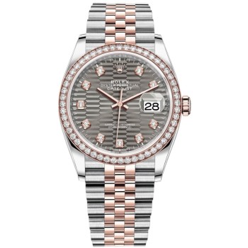 Rolex Datejust 36 falso em aço e amp; Relógio feminino Everose Gold Slate com motivo canelado e moldura de diamante M126281RBR-0030